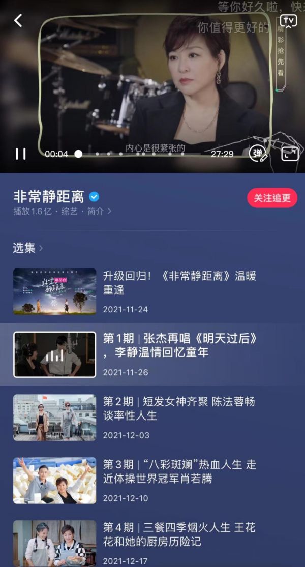 譬如,李静主持的《非常静距离》,抖音重启第一季已完结,前端正片累计播放量1.6亿。
