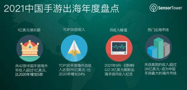 据Sensor Tower发布的《2021中国手游出海年度盘点》,去年有42款手游在海外市场获得了超过1亿美元的收入。其中,中国出海手游Top30在美国市场获得了36亿美元的收入,比2020年增长了53%,美国市场正式取代日本,成为中国手游最大的海外市场。