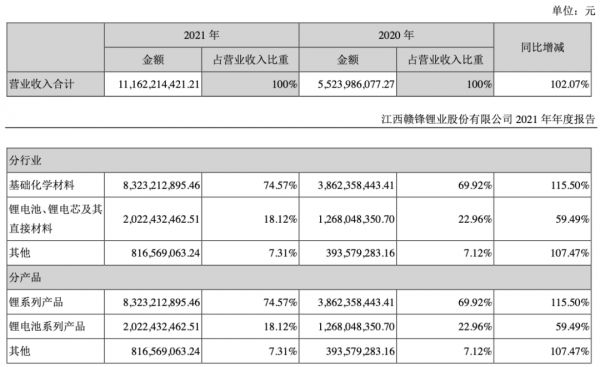 2021年,赣锋锂业实现营收111.62亿元,同比增长102.07%;实现归属于上市公司股东的净利润52.28亿元,同比增长410.26%。