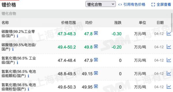 据上海有色金属网等市场数据,2021年初纯度为99.5%的电池级碳酸锂均价为5.3万元/吨,年末为27万元/吨,到今年4月12日,已上涨到了49.8万元/吨,期间涨幅高达839.62%;纯度为56.5%的电池级氢氧化锂(微粉型)2021年初均价为5.5万元/吨,到今年4月12日已涨到49.95万元/吨,期间涨幅高达808.18%。