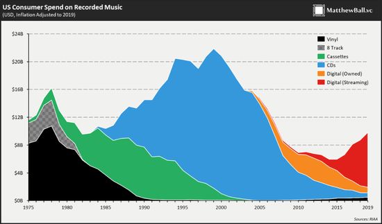 更诡异的是,这期间,收听的核心体验(或者可以理解为为消费者创造的价值)也是在不断提升的——磁带的发明为消费者提供了便携性,CD的发明则带来了音质的提升和歌曲与歌曲之间的可分离性,下载技术提供了海量库存,而流媒体则提供了随时随地的无限收听选择...事实上,体验维度的提升是如此显著,以至于消费者完全愿意反反复复地为同一首歌付费,以在新的载体上再次收听。即便是这样,这依然是个没有在增长的市场!