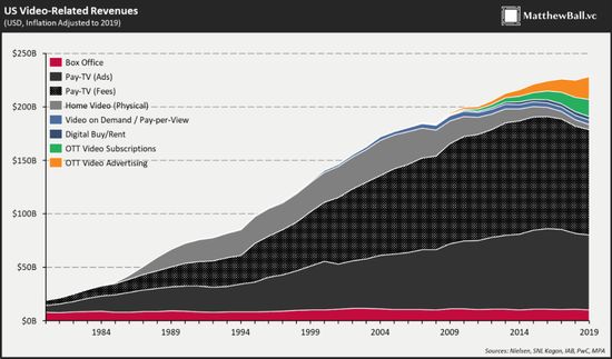 和音频比起来,视频的发展轨迹就截然不同了:从院线电影到卫星电视、从卫星电视到有线付费电视,卫星传输、光纤、互联网这些技术载体的变迁,每一次都扩大了视频内容的消费市场。Netflix渐渐地瓦解好莱坞建立起的电影秩序,并引发越来越普遍的有线电视弃用,可视频领域的整体市场从未像今天一样大。