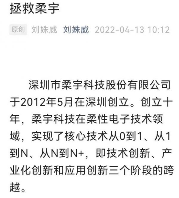 4月13日上午,中央财经大学中国企业研究中心主任刘姝威在朋友圈分享自己的公号文章《拯救柔宇》。文章称, 建议各级政府积极帮助柔宇科技解决资金短缺,帮助柔宇科技引进战略投资者 ,以便开拓我国柔性技术的应用市场。