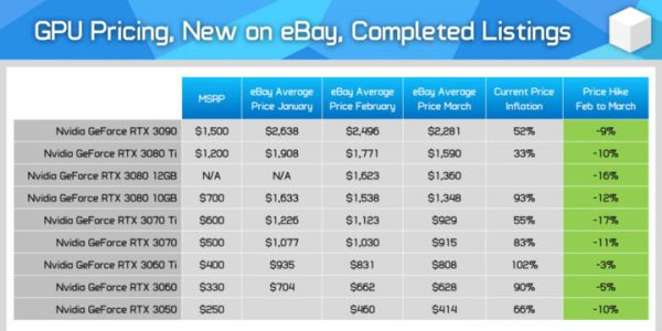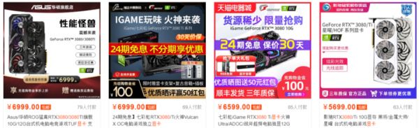 3 月下旬,高端显卡 GeForce RTX 3080 TUF Gaming OC 的价格在澳洲市场一天内跌幅达到 35% ,报价由 2299 澳元(约 1 万元人民币)降至 1499 澳元(约 7 千元人民币), 创史上最大跌幅。同期,京东电商有 RTX 3080 Ti 出现「破发」情况——最低售价 8399 元,而英伟达官方售价为 8899 元。