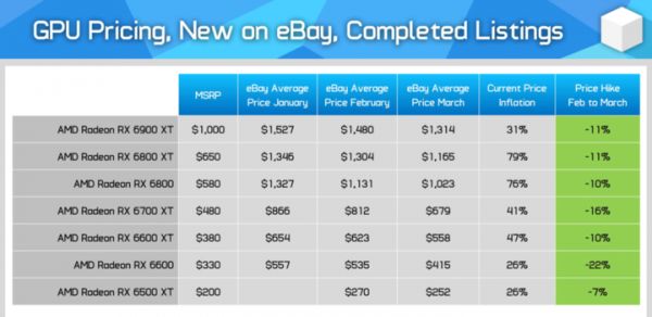 根据美国电商平台 NewEgg 上的数据,英伟达和 AMD 的价格年后一直下降。英伟达 30 系目前整体溢价 72%,平均下跌 10%;AMD 目前平均溢价 47%,平均下跌 13%。
