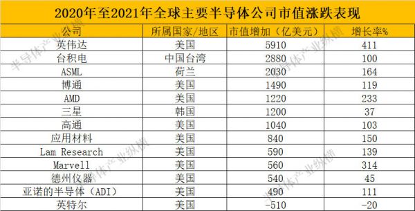 市值增长前100家公司中,共有12家半导体公司上榜。半导体设备业表现尤其出色,ASML、应用材料和Lam Research,前三大设备厂商都榜上有名。三大设备公司中扼住先进工艺咽喉的ASML以独供EUV光刻机的优势,市值增长2030亿美元,达到3270亿美元,成为半导体设备市场市值第一名,表现十分亮眼。