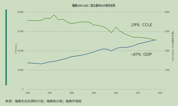 在瑞典1990年到2019年的20年间,瑞典在二氧化碳当量减少29%的情况下,仍实现了87%的GDP增长。这也侧面证明了,经济发展和碳排放是能够脱钩的。