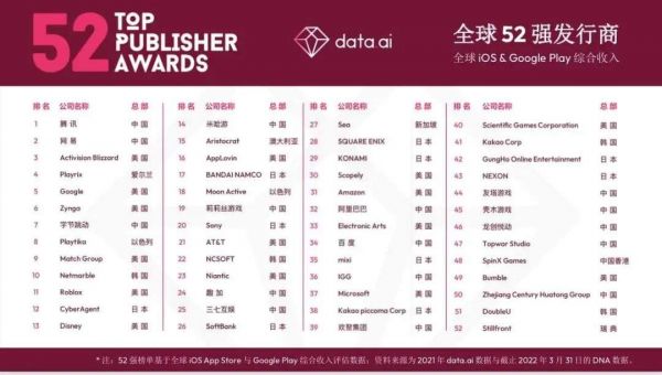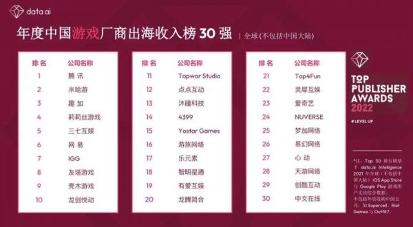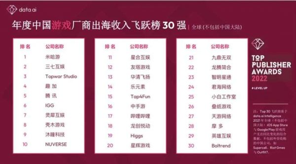 昨日(4月12日),data.ai公布了4个维度的榜单介绍,分别是全球发行商52强、游戏出海发行商排行榜、年度中国非游戏厂商出海收入榜 30 强及年度中国游戏厂商出海收入飞跃榜 30 强。