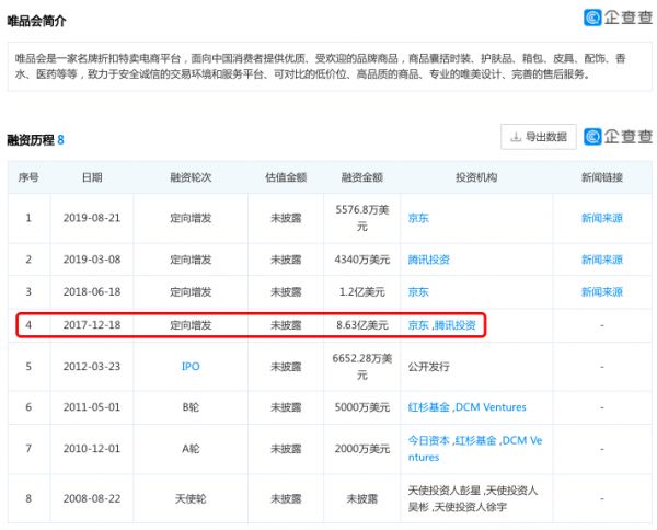 2017年12月18日,腾讯、京东与唯品会达成协议,两者将以现金形式向唯品会投资总计约 8.63 亿美元。后两家公司都经过增持,截至2021年12月21日,腾讯旗下Tencent Mobility Limited持股唯品会9.5%;京东实体持股7.5%。