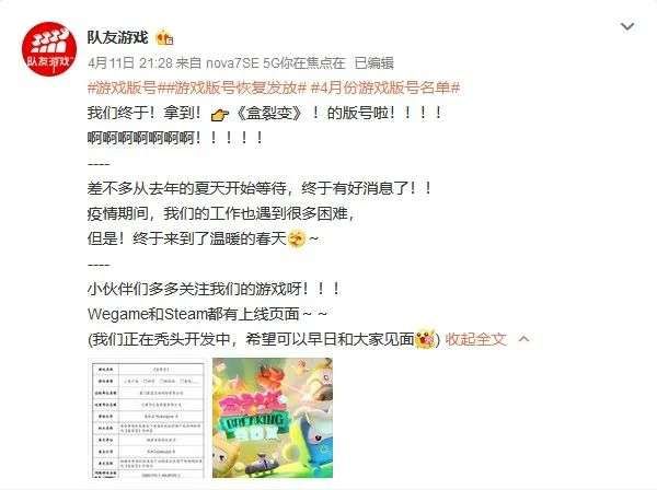 版号时隔263天后重新开始发放,对于游戏行业来说确实是难得的好消息,心动CEO黄一孟在社交媒体上欢呼“国内版号终于开闸了,泪大喜奔”。获得版号的游戏工作室们也纷纷通过各种方式向玩家传达他们的喜悦,《盒裂变》的开发商队友游戏发微博说,版号重新发放后,“终于来到了温暖的春天”。