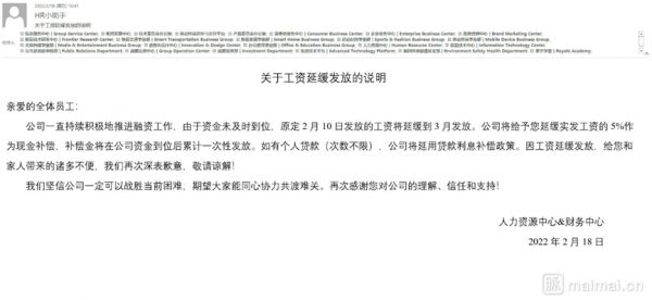 2022年3月30日,有网友在职场社区平台脉脉上爆料,柔宇开启邮件发薪模式:每个月底收到的不是工资,而是一封欠薪邮件。