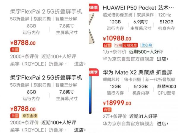 而柔宇折叠屏手机在2020年上半年产量4.86万片,销售2.21万片。翻看京东自营店评价,柔宇评价在2000条左右,华为均在万条以上。
