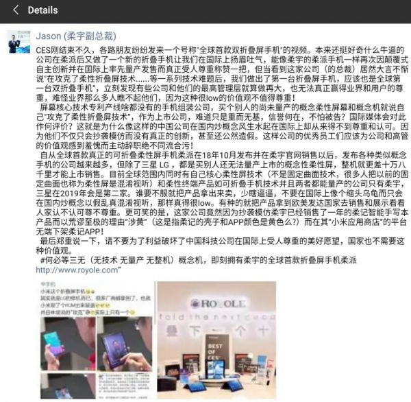 2019年,柔宇公开指责小米公然造假,“炒概念”。小米总裁林斌发布微博,宣称小米攻克柔性折叠屏技术,做出全球第一台双折叠手机。柔宇科技副总裁樊俊超随后在其朋友圈,发长文怼小米价值观Low,称全球拥有柔性屏技术和柔性终端产品并且两者都能量产的只有柔宇。