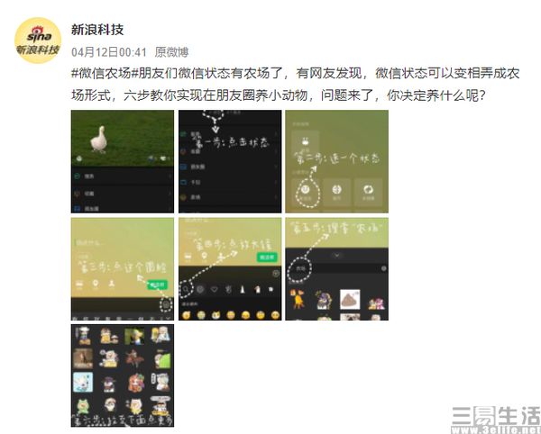 4月12日凌晨@新浪科技 发文称,“有网友发现,微信状态可以变相弄成农场形式”,很快#微信农场#这一话题就在4月12日早间达到“沸”的热度,并登顶热搜榜首位。