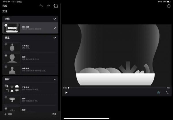而以「烹饪」风格为例,在进入编辑模式之后可以看到,在屏幕的左侧已经列出了一整套完整的分镜流程,且每个分镜位置都有提示以辅助整个拍摄流程。