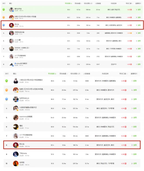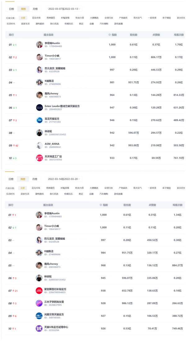 3月数据显示,在李佳琦开播日,淘宝直播带货日榜冠军没有悬念。当月李佳琦开播25天,霸榜日冠25次。6天未开播日,榜首位置则分属“烈儿宝贝”“K姐陈洁”等头部主播。同时,李佳琦Austin、Timor小小疯、烈儿宝贝、K姐陈洁、南风cheney等5大主播几乎包揽了3月份周榜前5名的位置,甚至次序都未发生过改变。