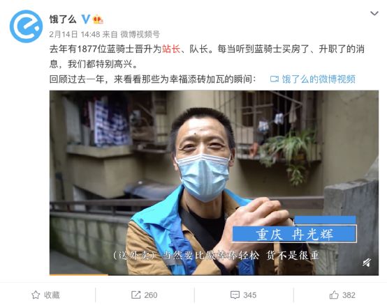 2月14日,饿了么在微博发文称,2021年有1877位蓝骑士晋升为站长和队长。其中,475位骑手晋升为队长、站长,1402位骑手成为储备站长和储备队长。