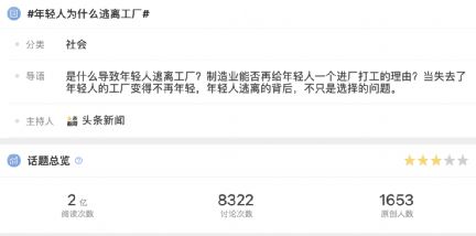 该议案一出,便引发无数网友热议。当天微博“工厂该怎么留住年轻人”话题排第一,截止发稿前,阅读量破2亿,近万人留言讨论。