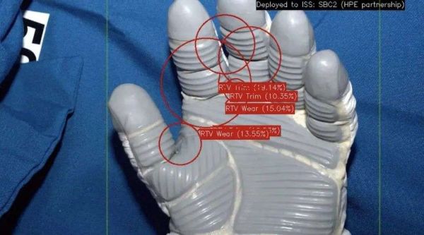 经过数据集训练后的 AI 和 ML 自动化手套检查过程,在太空行走后宇航员脱下宇航服时,会为宇航员的手套拍照,这些图片会立即发送给国际空间站上的 HPE Spaceborne Computer-2(星载计算机-2)。