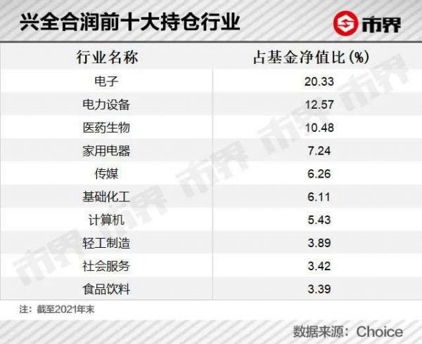 兴全合润2021年年报显示,该基金持有占净值比重超过5%的行业有7个,其中电子、电力设备和医药生物占比均超10%,另外则是家用电器、传媒、基础化工及计算机行业。