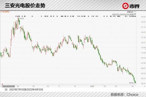 三安光电是在2021年8月5日创下高点44.92元后持续回调,至2022年4月8日收盘股价22.76元。闻泰科技则是在2021年12月16日创下高点143.88元后回调,至2022年4月8日收盘价75.88元。