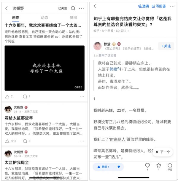 盐选会员专栏是这类网络爽文的集散地,《豹变》在知乎上看到,多篇网文伪装成热门问答,展示在盐选会员页面顶部,比如“十六岁那年,我欢欢喜喜嫁给一个太监”“人贩子绑架年轻野模欲行不轨”等故事。