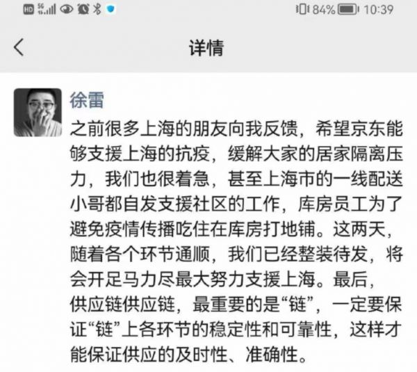 4月8日凌晨,有媒体曝光了京东CEO徐雷连发的两条朋友圈:“京东在抗疫救援方面,从来不惜力,从来不算账,也愿意用自己最擅长的供应链能力高效支援任何需要的城市”,“现在好了,我们终于可以使劲了,这两天随着各个环节通顺,京东已经整装待发,将开足马力尽最大努力支援上海。”