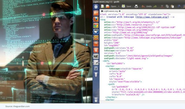 关于技术素养的二元认知也可以从影视作品可笑地歪曲软件工程师实际工作这一经典模因中得以体现。在几乎任何相关的电影中,你都能看到“程序员”在面对下图中的工作场景: