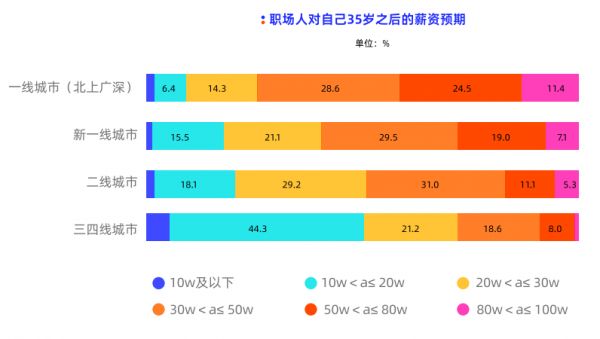 在职场人尚未步入35岁的阶段,时常对未来有过于美好的期待。根据脉脉人才智库《乘势而上·人才流动与迁徙2022》报告数据显示:在一线城市,超过十分之一职场人认为35岁至少年薪80万。