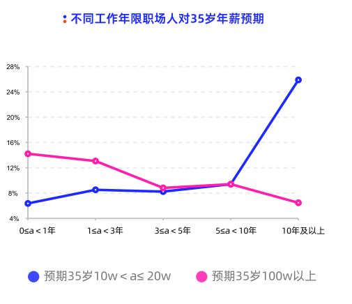 但随着工作年限增加,大部分职场人不得不接受骨感的现实。在初入职场的新人中,14%左右认为自己在35岁时可以达到年薪100万;而在即将踏入35岁的职场人预期中,认为自己35岁可以年薪100万的比例仅为9%左右。
