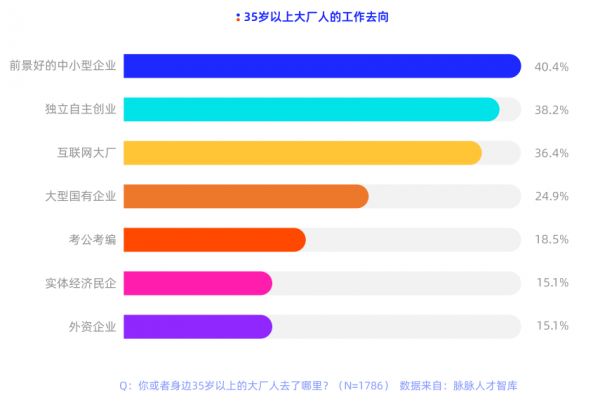 根据报告数据,40.4%的资深大厂人离职后会跳进前景好的中小企业,而另有接近四成的大厂人会选择自己当老板,还有36%的人依旧在互联网大厂之间做选择。