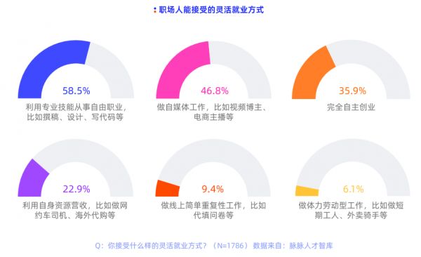 而为了开源节流,提高抗风险能力,像张萌一样尝试副业的大厂人也不在少数。数据显示,接近六成职场人倾向于利用专业技能从事自由职业,比如撰稿、写代码等工作来实现灵活就业。近一半职场人愿意从事自媒体工作“挣外快”,而仅6.1%的职场人接受体力型劳动。