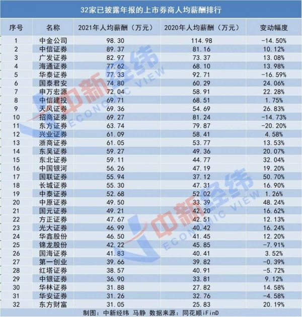 中新经纬根据同花顺iFinD数据统计发现,券商薪酬确实有“降”,但主要体现在管理层降薪,最高降幅为65.89%,员工薪酬则依各家公司情形和岗位不一,多数未降薪。管理层最高薪酬为中信证券执行委员会委员马尧,年赚1162.63万元,中金公司则以98.30万元的人均薪酬高居榜首。