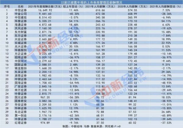 华泰证券、东吴证券、长城证券、兴业证券、国元证券、东方财富、广发证券、华鑫股份、国联证券、中信证券、海通证券、光大证券、东北证券等13家券商管理层人均薪酬则未出现下降。