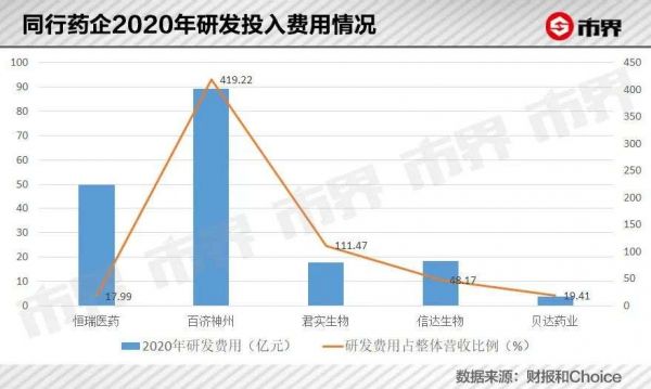 2018年至2020年,贝达药业的研发投入分别为3.04亿元、3.26亿元及3.63亿元,占整体营收的比例却在逐年下滑,从2018年的24.8%下滑至2020年的19.4%。2021年贝达药业研发费用为5.66亿元,占比为25.2%。