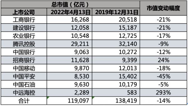 与业绩平稳增长对比来看,十大最赚钱公司市值规模缩水让人印象深刻。统计发现,十大最赚钱公司的最新市值11.9万亿元(截至4月13日),而疫情之前的2019年底,这十大公司总市值为13.8万亿元,两年多时间市值缩水近2万亿元,降幅14%。