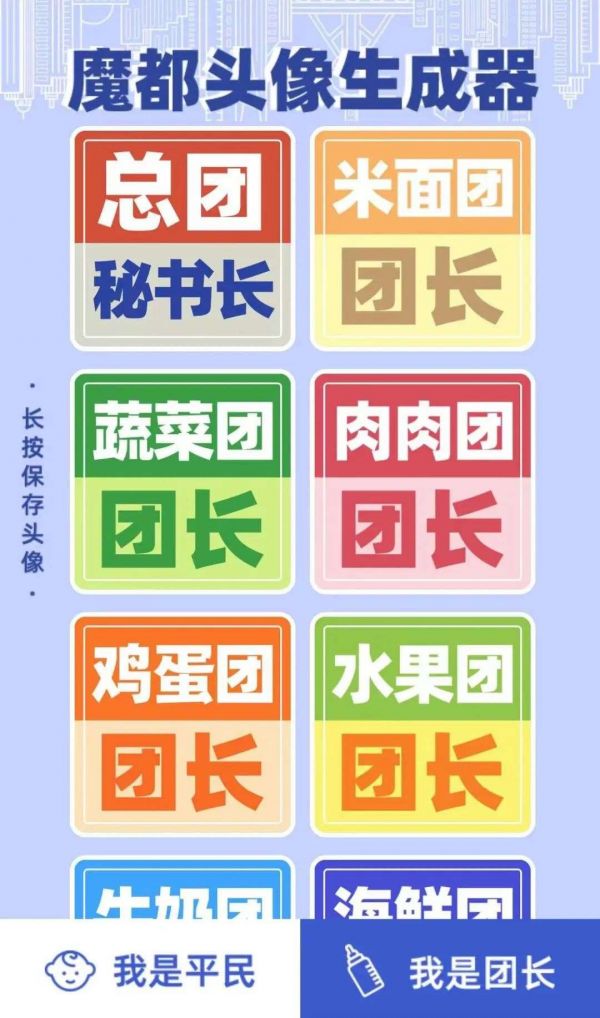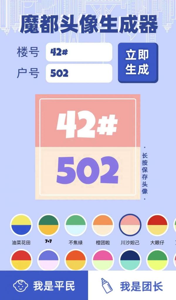 在“魔都头像生成器”小程序,普通居民可以选择“我是平民”,再输入相应的楼号、户号,就可以生成属于自己门牌身份的头像,而且还能选择不同的颜色。每一种颜色的取名也通过了精心的设计,像不焦绿、橙团啦、我想吃菜、可乐自由……都和这次疫情中发生的事或者大家的心声有着一定关联。