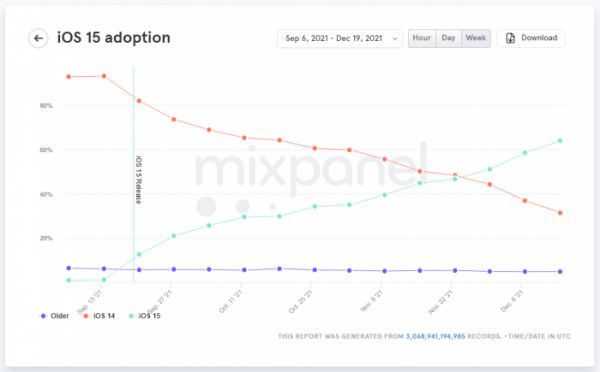事实证明,并不只是我一个人有这种想法。根据第三方网站Mixpanel公布的数据显示,在iOS 15正式版推出三个月后,只有60%的用户将iPhone升级到了iOS 15,作为对比,同期的iOS 14更新率在80%左右,足见其差距。