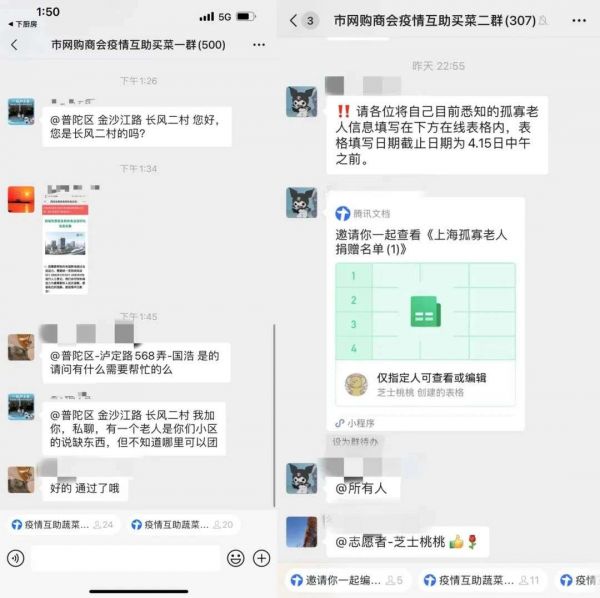最近独居老人比较受关注,我们在群里也会通过腾讯文档等形式,力所能及地匹配到一些缺物资的老人,就是觉得大家其实在这方面特别有爱心,有责任心。我们也在努力去做更多事情。