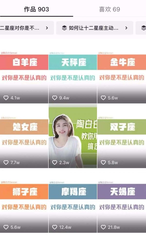 一个典例是2021年在抖音吸粉千万的星座博主“陶白白Sensei”。其视频内容集中在以星座情感问题上,例如十二星座如何缓解emo,这些话题牢牢吸引了年轻人的注意力。而“你愿意为了我去陶白白搜星座吗”,这样由粉丝完成的造梗和二次创作,也助力了其火爆。[5]