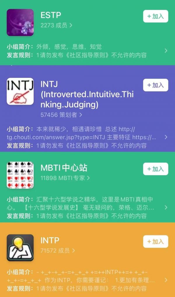 在豆瓣、知乎等内容社区中,人们以小组和问题为中心聚在一起,逐渐形成稳定的趣缘社群和圈层,讨论着关于MBTI的一切事情:它的心理溯源,学术应用,每种类型的人有怎样的性格特质,适合什么样的工作,和什么类型的人更匹配……