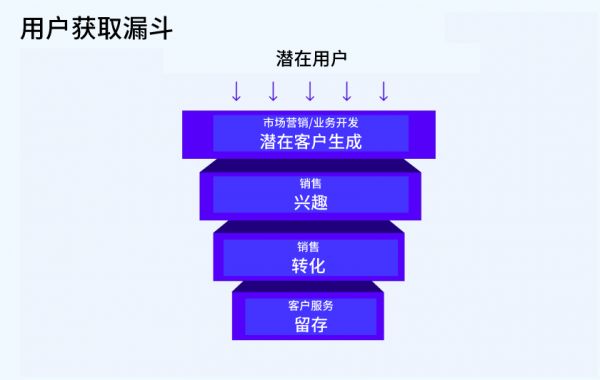 “用户获取漏斗”这一概念是进入市场的核心,大多数企业也非常了解这一概念,其具体包括漏斗顶部的潜在用户生成,以及漏斗底部的用户转化和留存。