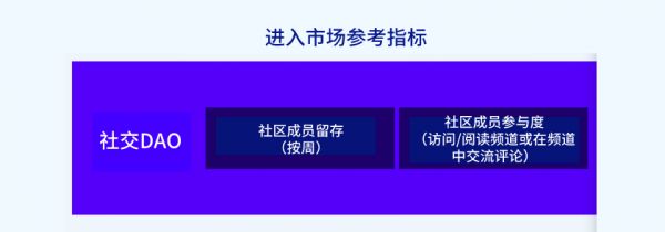 社交DAO的进入市场指标:衡量DAO健康水平的关键指标之一,即社区的参与质量,这可以通过其使用的主要沟通及治理平台来衡量。例如,DAO可以追踪Discord上的频道活动、会员激活和留存情况、社区会议及参与治理情况(比如谁给什么投了票,以及投票频率等),以及实际完成的工作(比如付费贡献者的数量)。