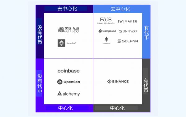 下图中,左下方象限中的许多公司(即没有代币的中心化组织)都为用户提供了访问Web3基础设施和协议的入口或接口。