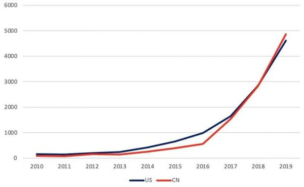 在专利上,中美两国成为市场的充电力量。AI专用硬件对于确保软件能够及时、全面地提供结果可能更加重要。下图显示了过去十年来中美两国在人工智能芯片专业开发领域的专利创新进展。在此期间,中国在每年的专利创新方面一直紧跟美国的步伐,2019年,中国首次超过美国。