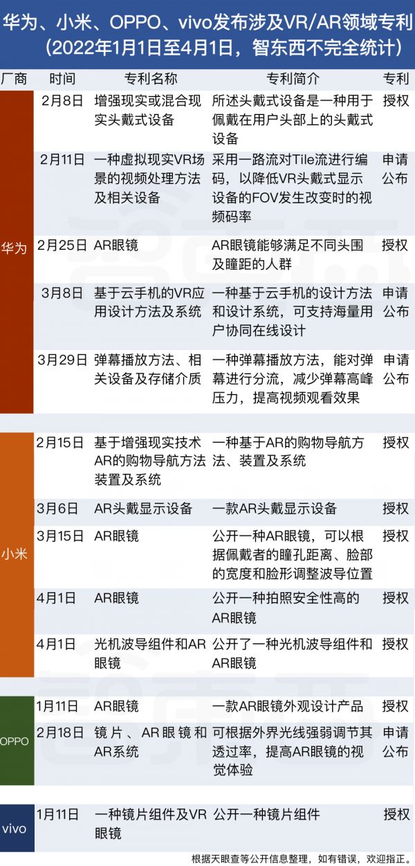 据智东西不完全统计,仅2022年,华为、小米、OPPO、vivo四家手机厂商就公布了13项与VR/AR有关的专利,涉及VR/AR基础技术、外观设计、光学显示等多个领域。