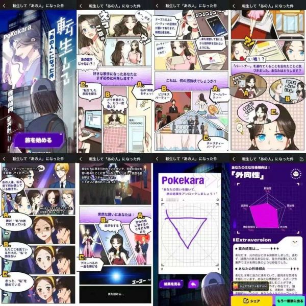笔者曾在《日本排名第一的“本土”K 歌 App,来自中国》一文中提到,作为一款 K 歌 App,Pokekara 在产品主页放置了一个以重生为主题的漫画版人格测试,系统会根据用户代替漫画中角色作出的选择推导出用户的性格。