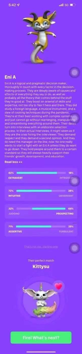 除了外观,不同的图腾也代表在性格、决策、情感等维度的不同特点,并且 XOXO 还会根据测试结果给出最适合彼此的图腾并作为匹配算法中的重要一环。