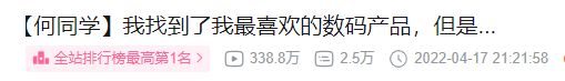 尽管这则视频不同于此前专注于产品的新奇测试或有趣产品的研发,但 B 站网友依旧对“有趣”的何同学充满热情:截至 4 月 18 日 17:00,距离何同学这则视频的发布还不到 20 个小时,该视频播放量已达 338.8 万、点赞 75 万、投币 87.9 万,登上全站排行榜最高第 1 名。