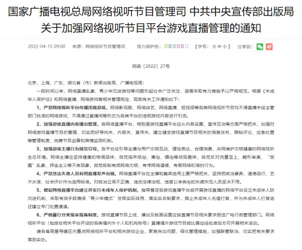 在国家广播电视总局网络视听节目管理司、中共中央宣传部出版局联合发布的《关于加强网络视听节目平台游戏直播管理的通知》中,相关条款一方面是基于直播领域近期的监管重点,比如加强内容管理、规范主播行为、严禁违法失德人员出镜等。